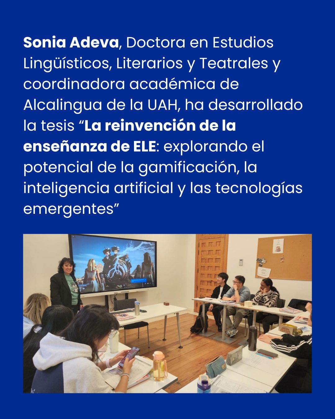 Sonia Adeva, doctora por la Universidad de Alcalá y coordinadora en Alcalingua, investiga cómo usar la inteligencia artificial y la gamificación para mejorar la enseñanza del español como lengua extranjera.