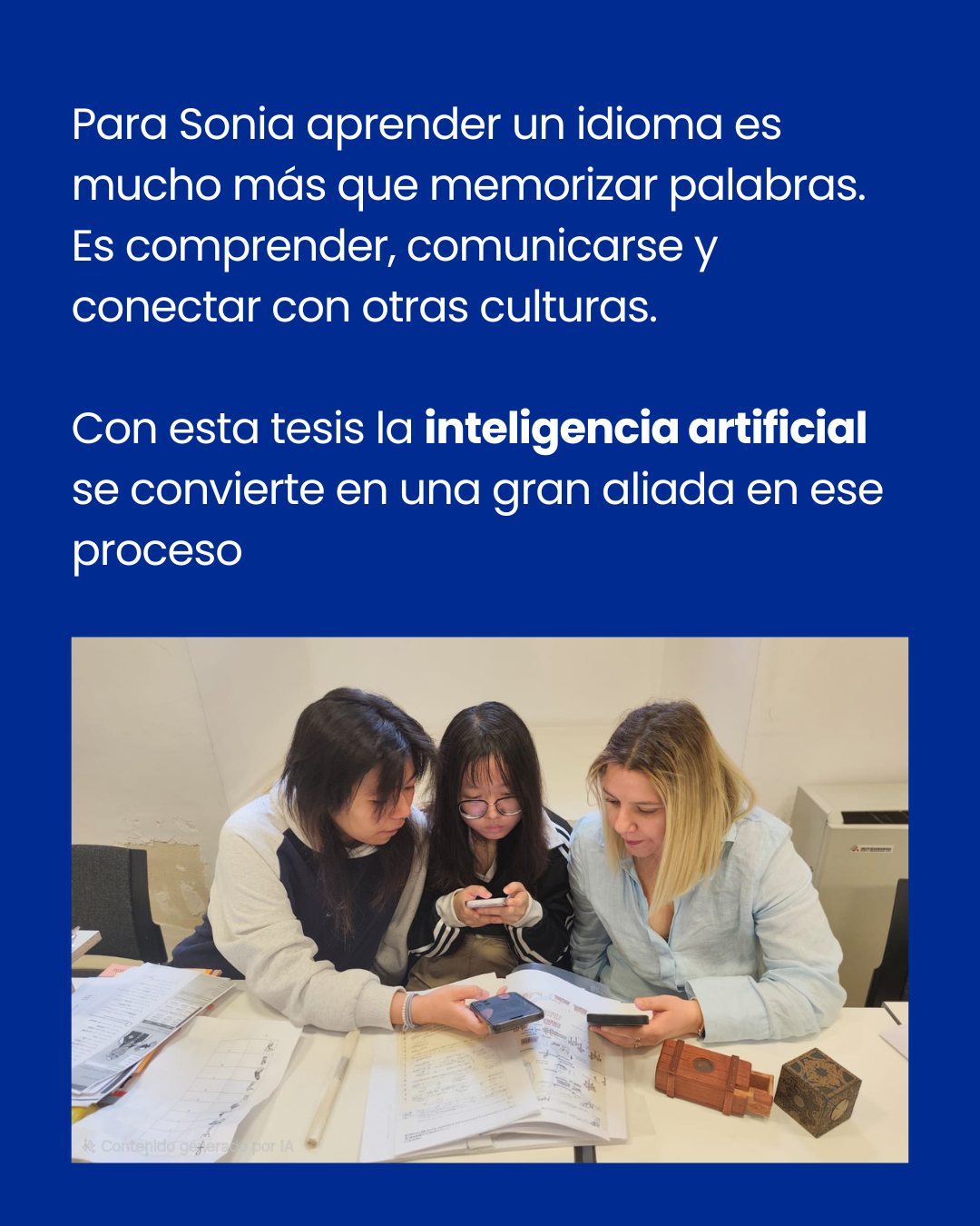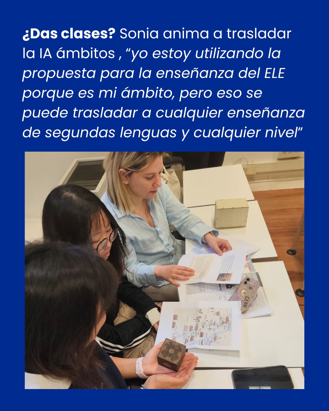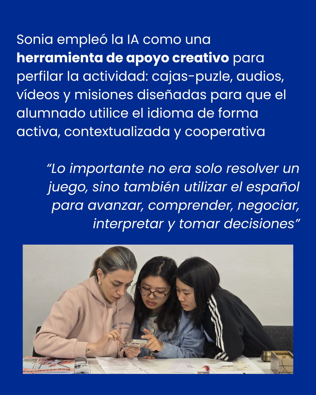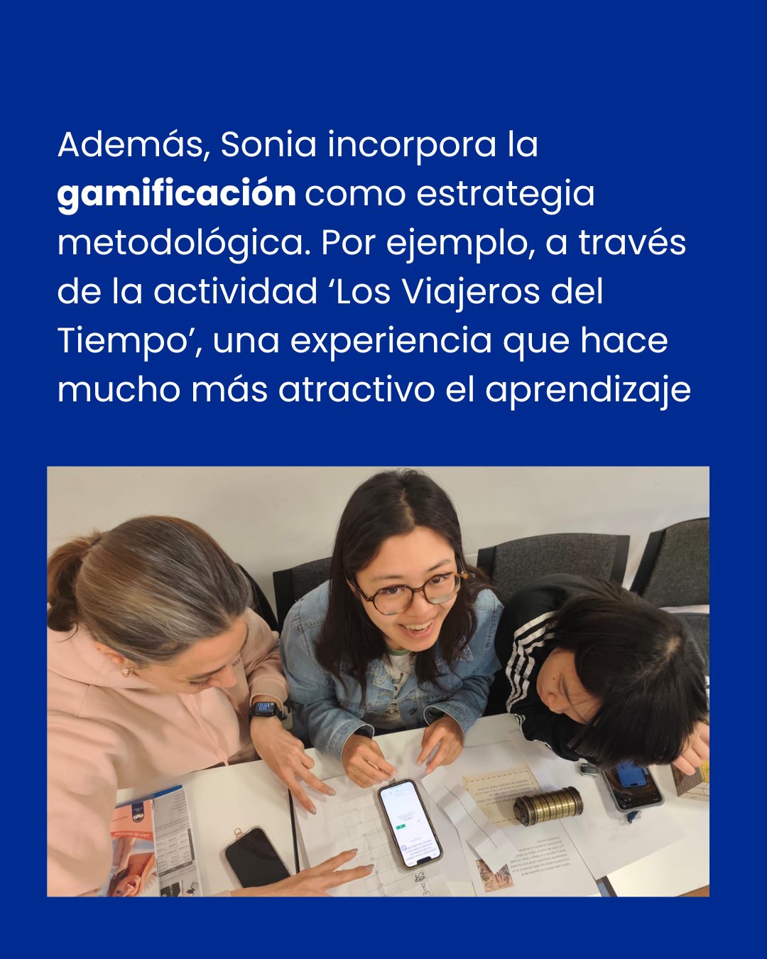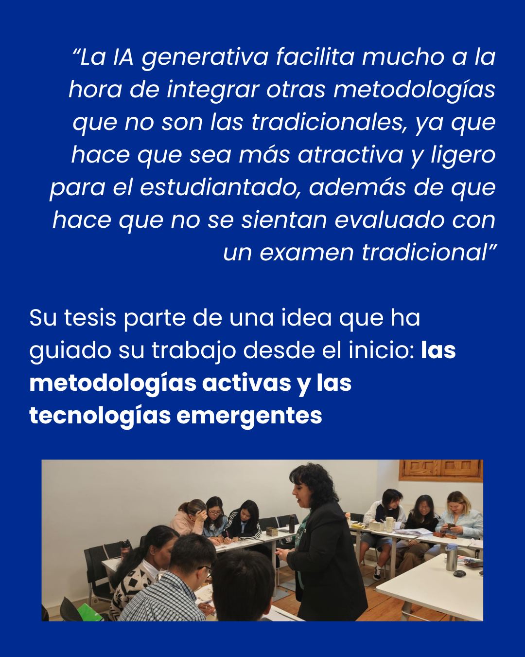 Su trabajo combina teoría sobre IA y una propuesta práctica: un escape room educativo llamado Los Viajeros del Tiempo, donde los estudiantes practican los tiempos pasados viajando por distintas épocas históricas.