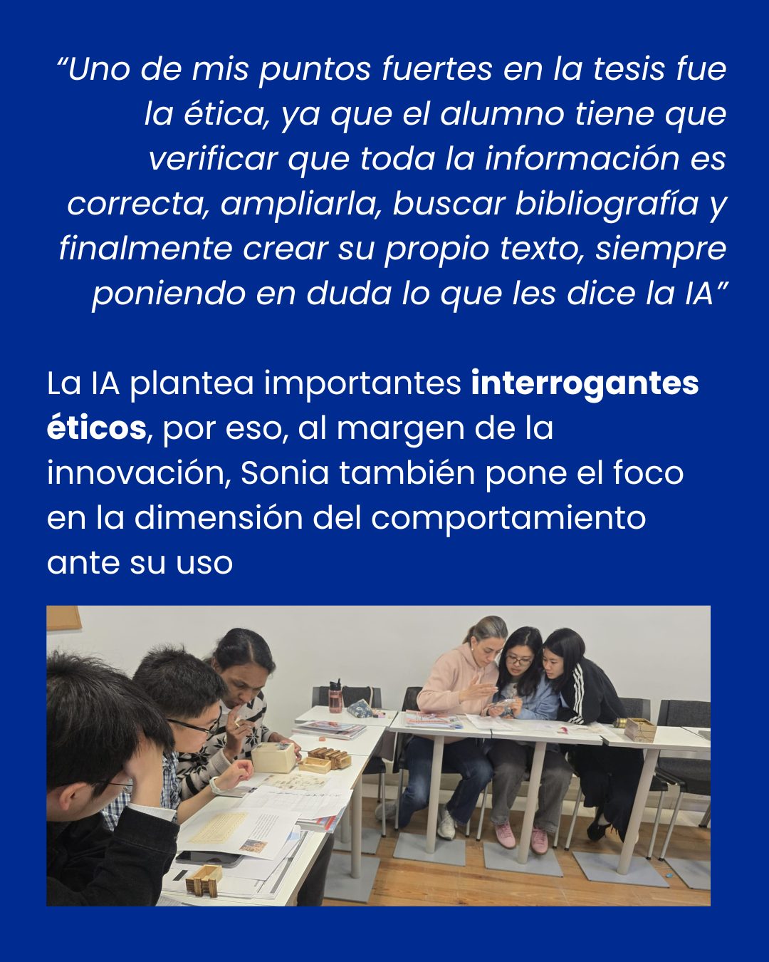 Adeva defiende que la IA no sustituye al profesor, sino que le ayuda a ahorrar tiempo en tareas repetitivas y a centrarse en la parte creativa. Además, permite ofrecer un aprendizaje más personalizado y atractivo, sin depender tanto de exámenes tradicionales.